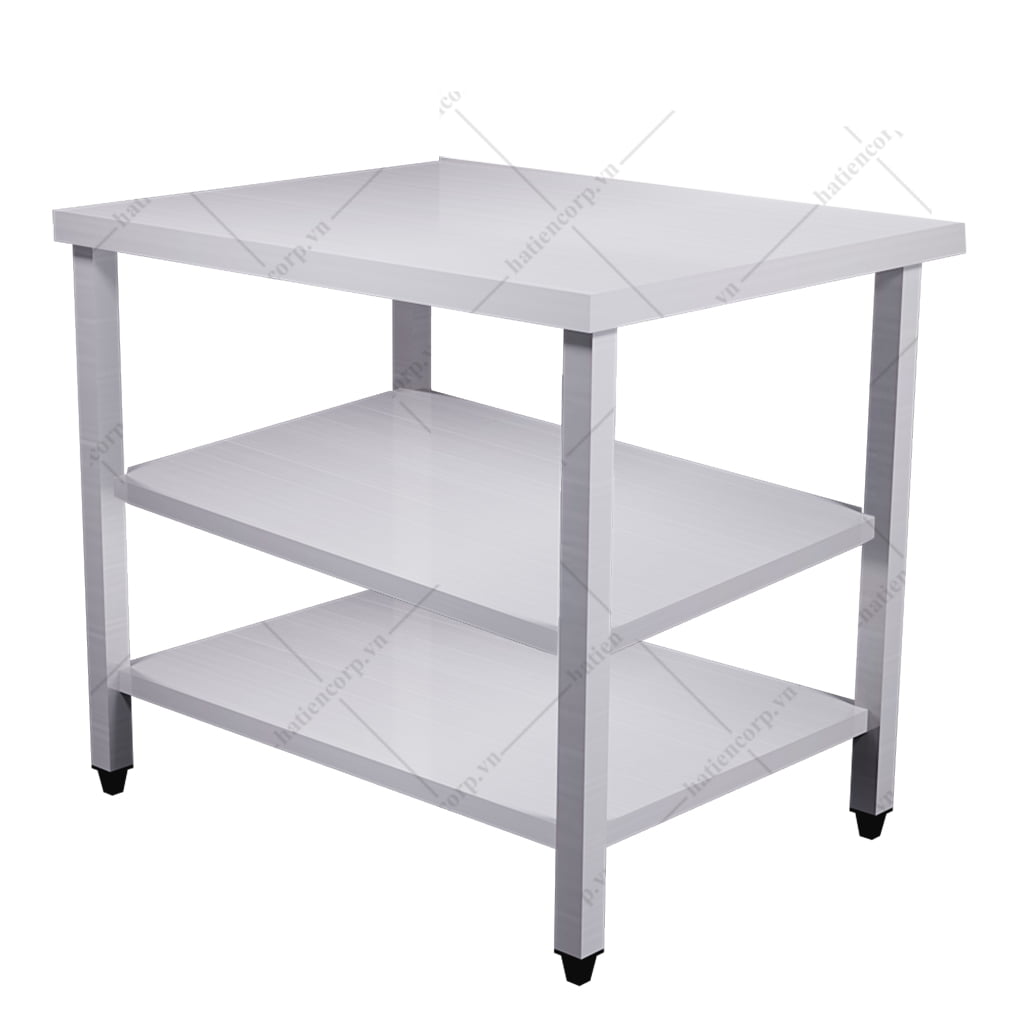 Bàn inox 3 tầng 1000x600x850mm Hà Tiên. Bàn inox 3 tầng Hà Tiên. Thường được đặt ở vị trí giữa nhà, trong khu vực sơ chế, khu bếp nấu, khu ra thức ăn và khu vực để chén đĩa (để được nhiều chén, đĩa, tô không quá cao) Được thiết kế thêm 2 kệ phẳng phía dưới, giúp tận dụng không gian. Bàn được sản xuất từ chất liệu inox 304 nhập khẩu từ hãng Hyundai, Posco của Hàn Quốc. Do đó, đảm bảo được các yêu cầu chất lượng, độ bền cao, chống rỉ sét tốt. Bàn inox 304 của công ty Hà Tiên được các kỹ sư tính toán thiết kế kỹ lưỡng kết cấu nên luôn đảm bảo chịu lực tốt. Đặc biệt được thiết kế đảm bảo an toàn vệ sinh thực phẩm trong điều kiện nhiệt độ cao, độ ẩm nhiều, thường xuyên tiếp xúc với dầu mỡ, muối, các gia vị khác…