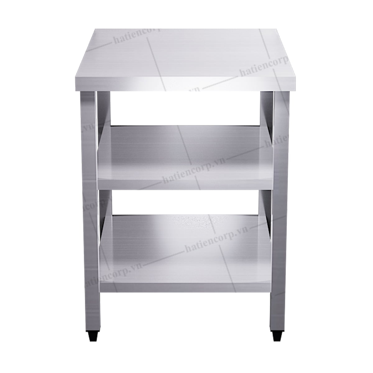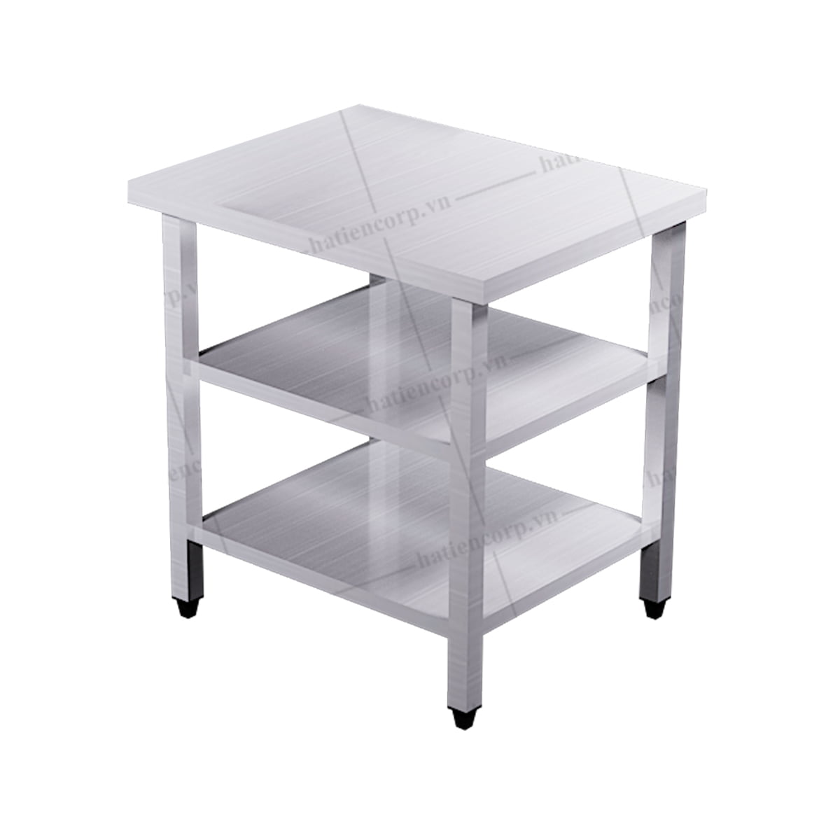 Bàn inox vuông 3 tầng 400x750x850mm Hà Tiên. Bàn inox 3 tầng Hà Tiên. Thường được đặt ở vị trí giữa nhà, trong khu vực sơ chế, khu bếp nấu, khu ra thức ăn và khu vực để chén đĩa (để được nhiều chén, đĩa, tô không quá cao) Được thiết kế thêm 2 kệ phẳng phía dưới, giúp tận dụng không gian. Bàn được sản xuất từ chất liệu inox 304 nhập khẩu từ hãng Hyundai, Posco của Hàn Quốc. Do đó, đảm bảo được các yêu cầu chất lượng, độ bền cao, chống rỉ sét tốt. Bàn inox 304 của công ty Hà Tiên được các kỹ sư tính toán thiết kế kỹ lưỡng kết cấu nên luôn đảm bảo chịu lực tốt. Đặc biệt được thiết kế đảm bảo an toàn vệ sinh thực phẩm trong điều kiện nhiệt độ cao, độ ẩm nhiều, thường xuyên tiếp xúc với dầu mỡ, muối, các gia vị khác…