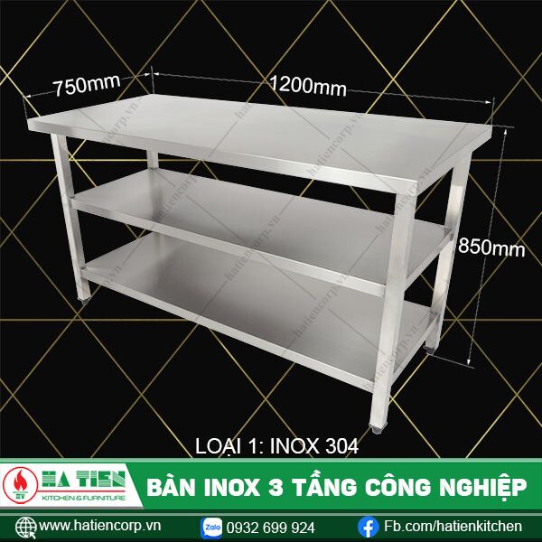 Bàn inox 3 tầng Hà Tiên làm tăng thêm không gian chứa đựng dụng cụ trong phòng bếp. Giúp khu vực chế biến món ăn, trưng bày, soạn chia thức ăn được rộng rãi hơn. Bàn được sản xuất từ chất liệu inox 304 nhập khẩu từ hãng Hyundai, Posco của Hàn Quốc. Do đó, đảm bảo được các yêu cầu chất lượng, độ bền cao, chống gỉ sét tốt. Bàn inox 304 của công ty Hà Tiên được các kỹ sư tính toán thiết kế kỹ lưỡng kết cấu nên luôn đảm bảo chịu lực tốt. Đặc biệt được thiết kế đảm bảo an toàn vệ sinh thực phẩm trong điều kiện nhiệt độ cao, độ ẩm nhiều. Thường xuyên tiếp xúc với dầu mỡ, muối, các gia vị khác.