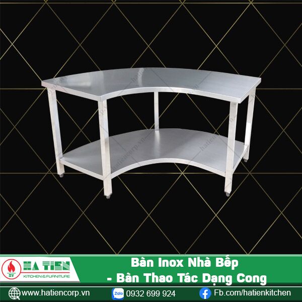 Bàn dạng cong của Hà Tiên có chiều cao phù hợp với phần lớn vóc dáng người Á Đông. Tạo được cảm giác thoải mái nhất khi nhân viên làm việc tại bàn. Bàn có thể lắp đặt ở bên trong và ngoài nhà bếp. Ngoài việc đựng đồ, bạn cũng có thể dùng nó để thái rau, nhào bột, thái thịt, làm những thứ liên quan khác trong khu bếp công nghiệp.