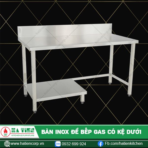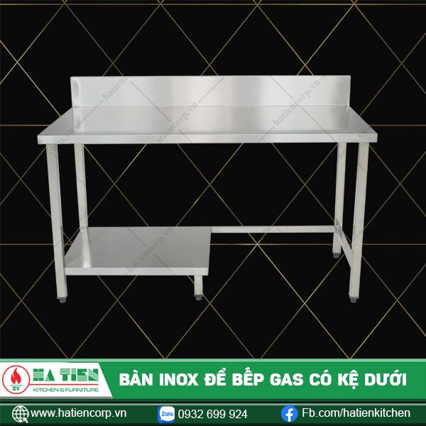 Bàn inox để bếp gas có kệ dưới là sản phẩm được thiết kế phù hợp với hầu hết mọi căn bếp. Chúng thường được nhiều hộ kinh doanh quán ăn gia đình, nhà hàng nhỏ lựa chọn. Thay vì phải xây cố định một bục để bếp ga, thì với mẫu bàn nay bàn chỉ cần đặt vào bất kì vị trí mong muốn trong khu bếp. Vừa tiết kiệm chi phí xây dựng, vừa thuận tiện cho việc di chuyển khi cần thiết.