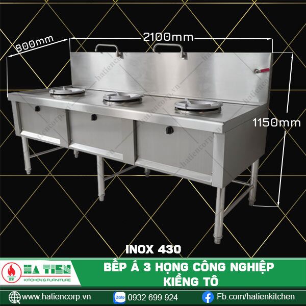 Bếp á 3 họng kiềng tô là dòng bếp gas công nghiệp gồm các họng cách xa nhau. Chuyên dùng với các nồi, chảo xào nấu cỡ lớn. Bếp có thể phục vụ suất ăn từ 300 đến 450 người cùng lúc. Nên đặc biệt phù hợp với những nơi đòi hỏi món ăn ra nhanh với số lượng lớn.