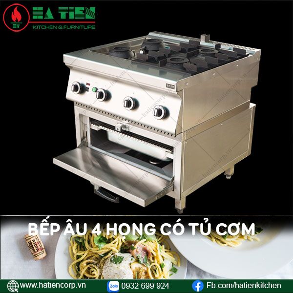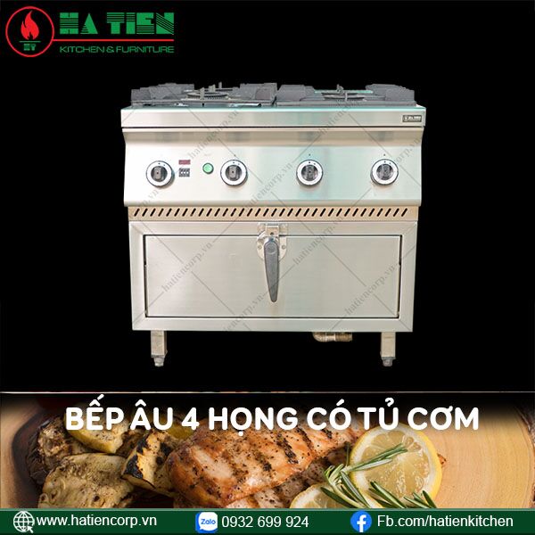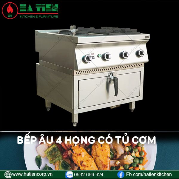 Bếp âu 4 họng có tủ cơm là sự kết hợp giữa dòng sản phẩm bếp âu dùng gas và tủ nấu cơm điện. Mẫu thiết bị này gồm có 4 họng đốt với tổng công suất gas 33400 kcal/h và có thể tháo rời dễ dàng. Ngay bên dưới là 1 tủ hấp cơm 1 ngăn có công suất điện là 5kw/h. Mang lại cho bạn một khu vực làm việc tiện nghi, để chế biến nhiều món ăn khác nhau cùng lúc.