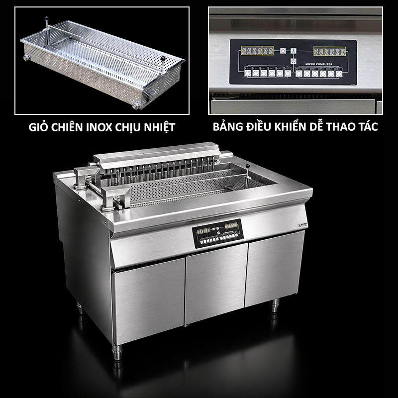 Với cơ chế nâng hạ giỏ chiên tự động, hệ thống lọc dầu tuần hoàn, cùng khả năng kiểm soát nhiệt độ chính xác, sản phẩm giúp tối ưu hiệu suất sản xuất và chất lượng món ăn đồng đều ở quy mô lớn.