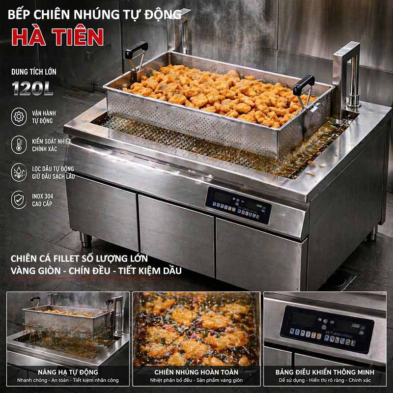 Trong các mô hình bếp ăn công nghiệp, nhà máy chế biến thực phẩm, chuỗi nhà hàng – khách sạn, nhu cầu chiên số lượng lớn nhưng vẫn phải đảm bảo món ăn chín đều, giòn đồng nhất, tiết kiệm nhân công là bài toán lớn. Bếp chiên nhúng tự động 120L Hà Tiên là dòng thiết bị chuyên dụng được thiết kế để giải quyết triệt để bài toán này.