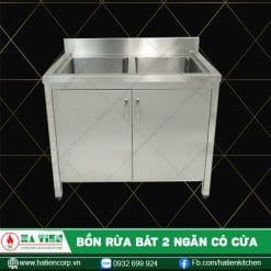 Bồn rửa bát inox 304 2 ngăn có cửa mở là sản phẩm chậu rửa công nghiệp có tính thẩm mỹ cao. Những cánh cửa đóng mở tạo thành tấm chắn, giúp che đi phần dưới của hộc rửa. Khi đứng nhìn từ phía đối diện, bồn rửa sẽ trông như một quầy tủ. Vừa đẹp mắt lại tiện dụng. Thiết bị thường được lắp đặt ở các khu pha chế đồ uống, quầy bar của nhà hàng, khách sạn…