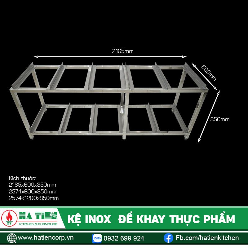 Kệ có kích thước: 2150x600x850mm. Toàn bộ kệ được làm từ inox 304. Thân kệ có kết cấu dày dặn, chịu nhiệt tốt.