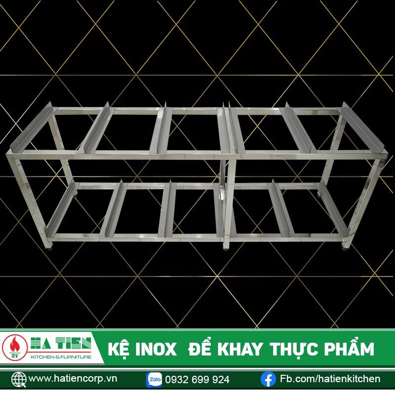 Kệ Inox Để Khay Thực Phẩm 10 Ngăn Hà Tiên là loại kệ đặc biệt, được gia công theo yêu cầu từ quý khách hàng. Kệ được thiết kế 2 tầng, mỗi tầng có 5 ngăn. Dùng để chứa các khay/ rổ thực phẩm trong bếp ăn công nghiệp, bếp nhà hàng, bếp trường học,… Kệ chắc chắn, gọn nhẹ, đơn giản và rất tiện dụng.