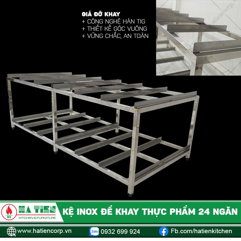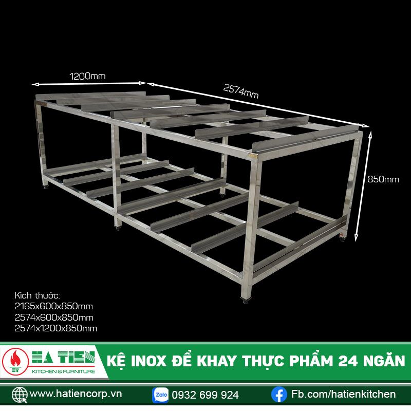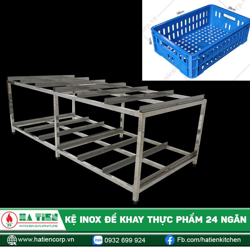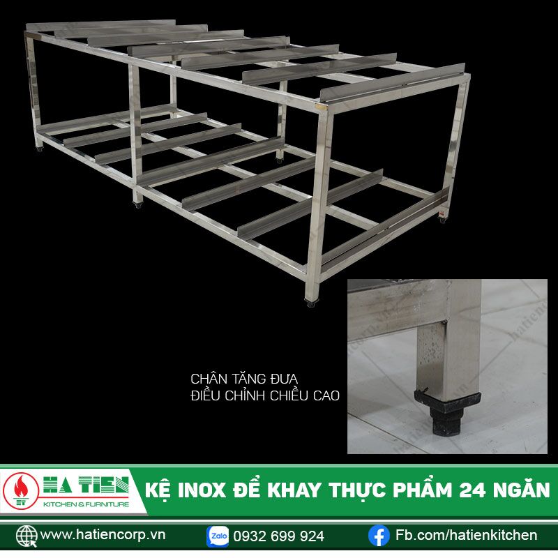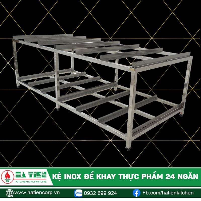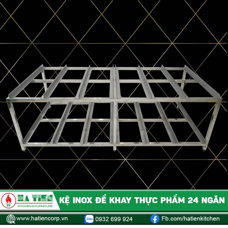 Kệ Inox Để Khay Thực Phẩm 24 Ngăn Hà Tiên là loại kệ có 24 ngăn để rổ thực phẩm. Kệ được gia công theo yêu cầu từ quý khách hàng. Sử dụng trong các bếp ăn công nghiệp, bếp nhà hàng, bếp trường học,… Kệ chắc chắn, gọn nhẹ, đơn giản và rất tiện dụng. Thiết kế 2 tầng, mỗi tầng chia làm 12 ngăn