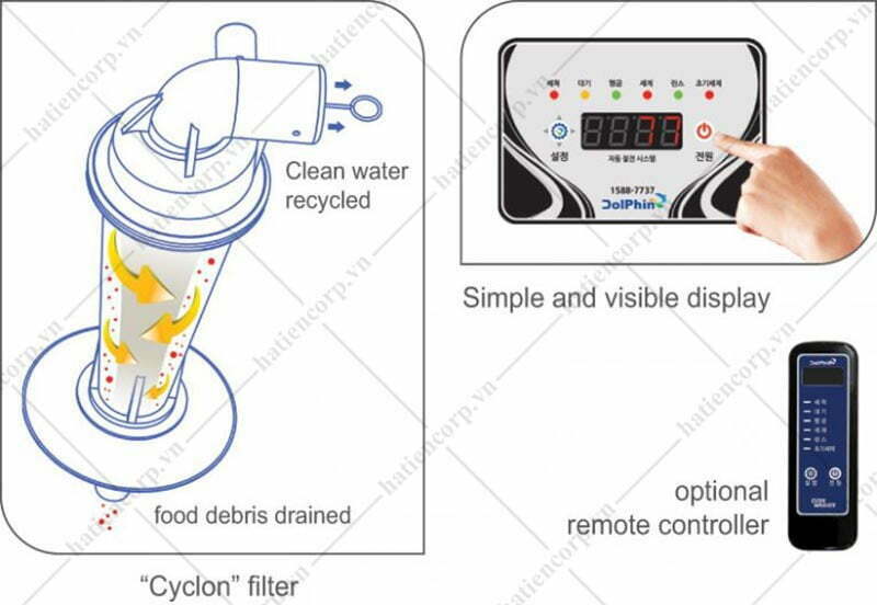 Bộ lọc thức ăn Cyclon, giúp xả rác thực phẩm sạch sẽ bằng nước sạch.Màn hình hiển thị cảm ứng, đơn giản tiện lợi khi làm việcCó thể gắn thêm remot (điều khiển) từ xa (Tùy chọn thêm)Điều chỉnh chu trình rửa [Đơn giản – 52 giây. / Tiêu chuẩn – 77 giây. / Mạnh – 112 giây] Tùy lựa chọn người dùng.Độ cao cửa rửa 400mm, có thể chọn cửa có độ cao hơn.