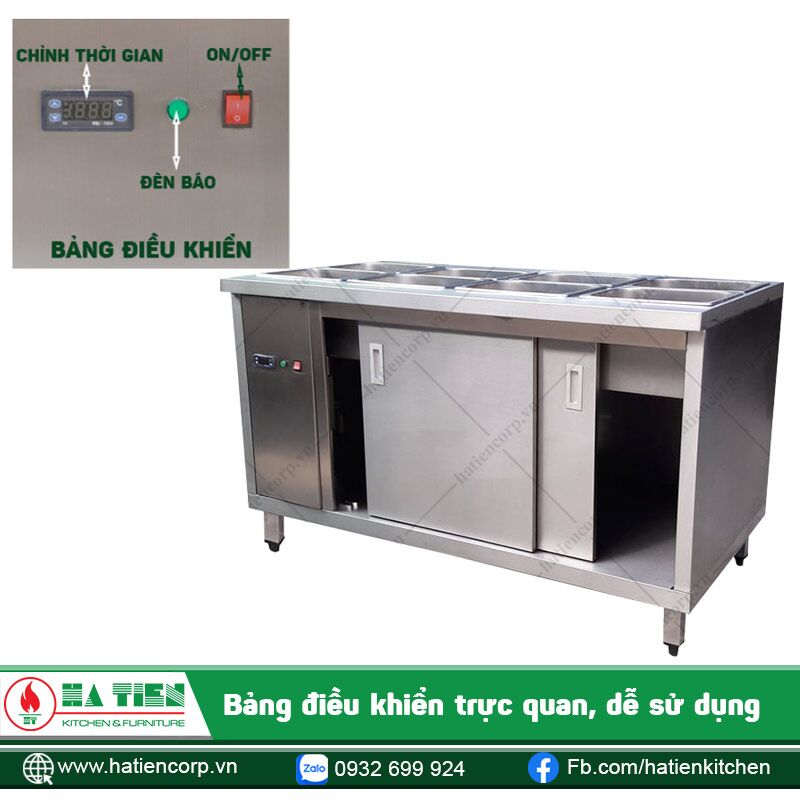 Sử dụng dòng điện 5Kw, quầy giữ nóng thức ăn: cơm, canh, hủ tiếu, đồ ăn đã chế biến…giúp chúng ta giữ nhiệt độ bảo quản thức ăn được nóng. Giúp chúng ta luôn được thưởng thức món ăn ngon miệng.