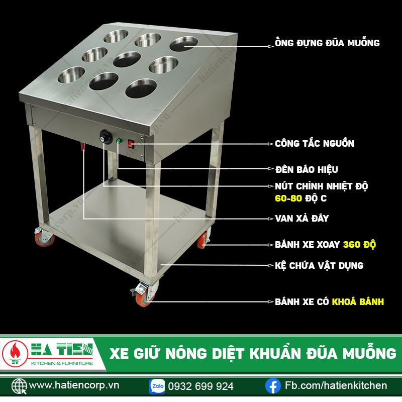 Xe giữ nóng được hoạt động nhờ điện trở. Với nhiệt độ giữ nóng đũa muỗng từ 60-80 độ C. Tuân thủ các yêu cầu về an toàn vệ sinh thực phẩm. Thúc đẩy tái chế để giảm ô nhiễm môi trường. Giúp bảo quản sản phẩm trong điều kiện tốt nhất có thể