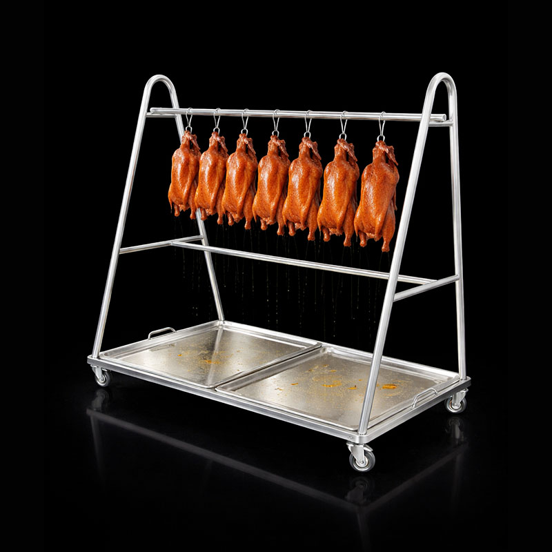 Khung chính được làm từ inox dày, gia công chắc chắn, đảm bảo chịu tải tốt khi treo nhiều vịt/heo quay cùng lúc. Thiết kế dạng chữ A giúp tăng độ vững, không rung lắc khi di chuyển. - Thanh treo và móc inox chuyên dụng